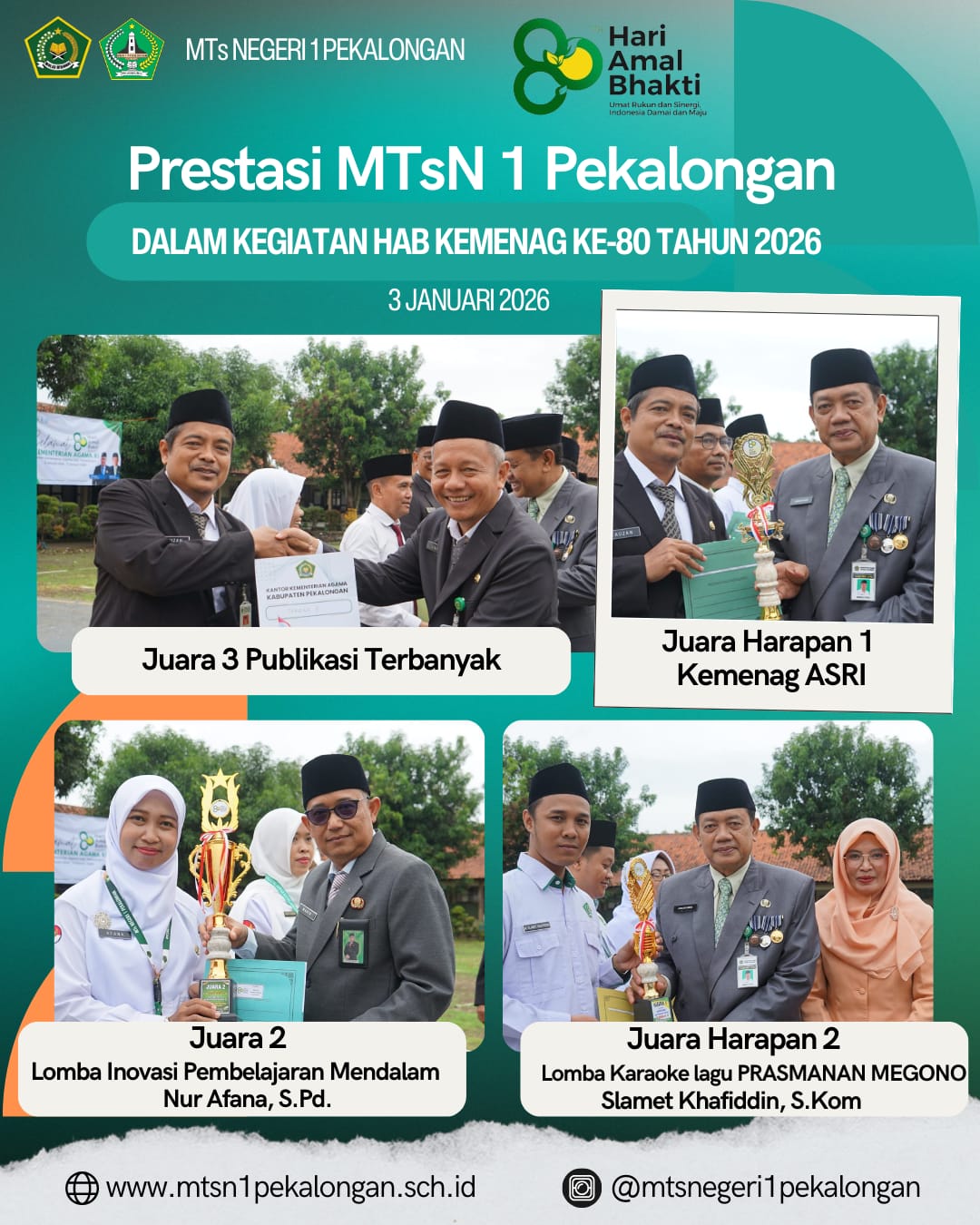 Dengan raihan prestasi tersebut, MTsN 1 Pekalongan semakin meneguhkan eksistensinya sebagai lembaga pendidikan yang berprestasi, berkarakter, dan adaptif terhadap perkembangan zaman, sejalan dengan visi Kementerian Agama dalam mewujudkan pendidikan madrasah yang unggul dan bermutu. ( MASANTUKA )